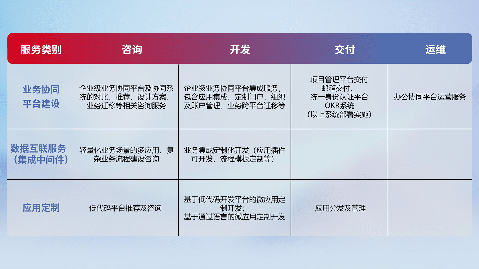 针对钉钉、、、、企微、、、IDaas等平台级产品提供产品的规划、、、、方案、、、、交付、、、定制化开发等服务,,实现如统一协同办公、、、、智能客户服务、、、、混合会议管理、、智能数据查询、、、等业务场景,,,实现数字化转型。。。。