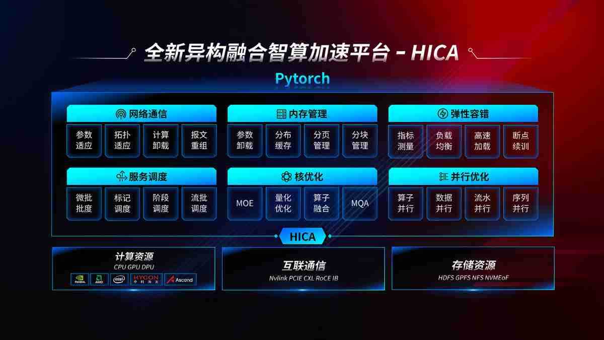通过自研的服务层、、、中间适配层、、、以及调度编排算法,,采用数据并行、、、、模型并行等多种并行方式,,,,把并行计算任务进行有效的分解,,使其分别由相应的软件栈和算力资源来承接。。。当GPU资源变化,,,HICA可以实时动态调度计算子任务并调整模型拓扑和架构,,,,以充分聚合各种算力资源。。