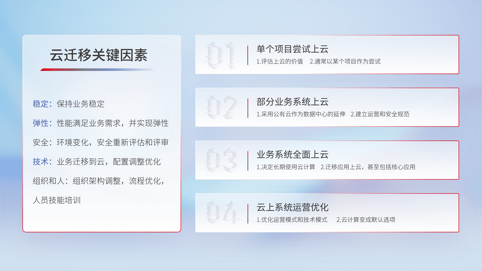 结合实际业务,,从规划设计、、云平台选型、、、云原生改造、、、、数据迁移、、、、集成交付,,迁移全过程为客户识别最佳上云路径,,做好风险识别管理,,,,设计网络架构、、、身份权限、、、、安全审计合规、、操作审计、、、、日志审计、、监控告警策略、、多站点容灾设计等,,,,对云上基础设施进行整体规划,,,提升IT治理水平,,以满足弹性、、、、高可用、、、高性能的需求。。。。