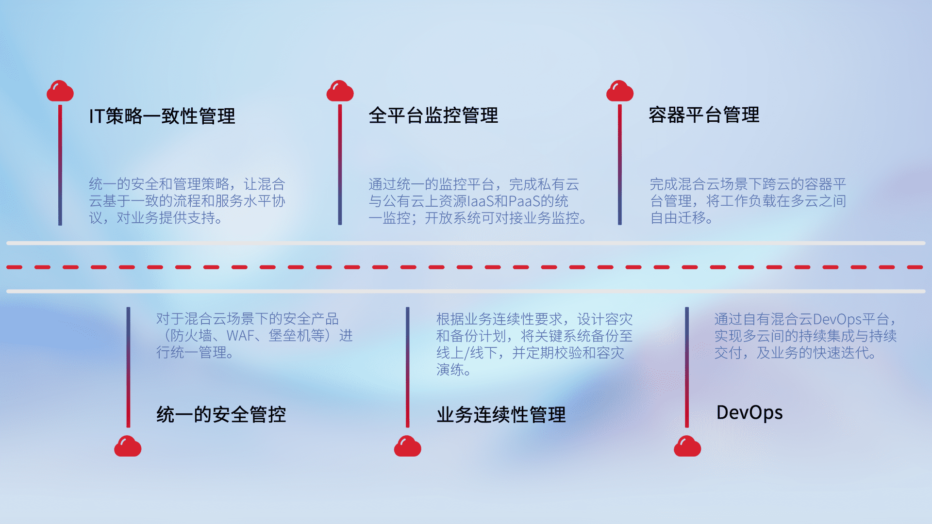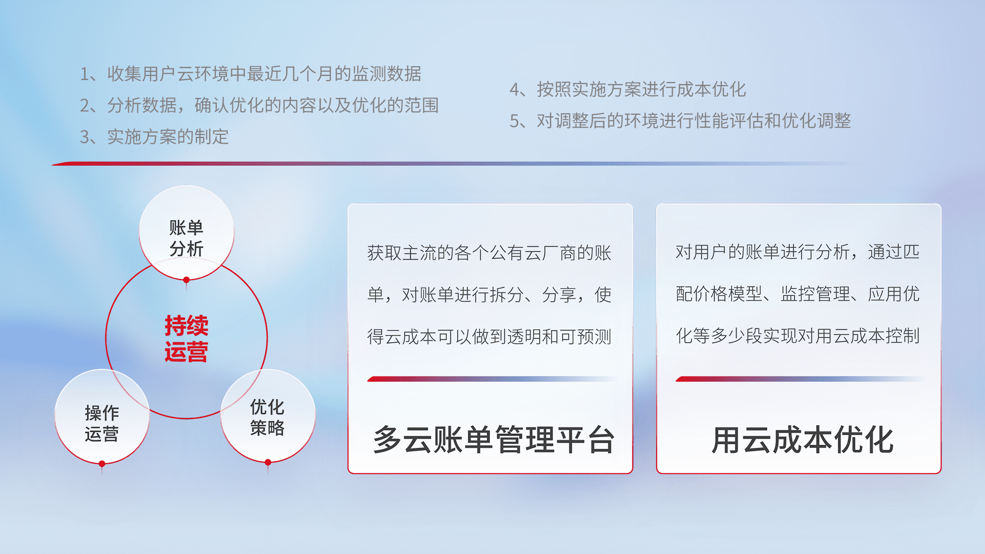 通过多云纳管,,,以统一的资源数据模型把客户的云资源进行抽象和封装,,,,进而实现对多云资源的统一操作,,,保障云资源管理的可靠性、、稳定性与可用性。。量身定制化运维内容,,,,配置、、、、开发运维、、补丁管理、、、、备份、、、监控、、认证和访问管理、、、审计和日常巡检等,,,保障在用云过程中的可靠度,,,,稳定度以及高可用率。。。。