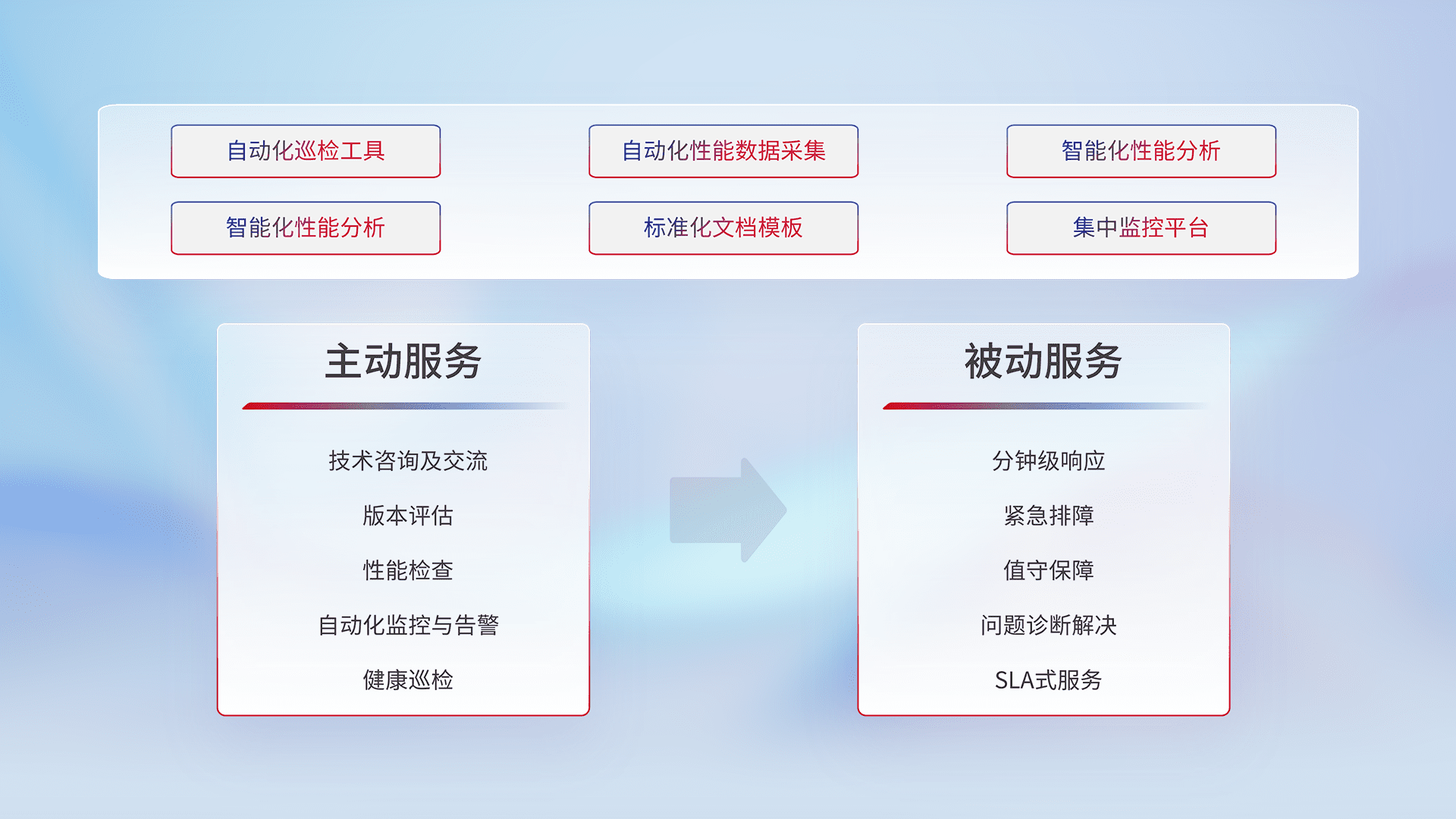 智能化工具和标准化文档,,保障服务质量,,提供主动服务(包含技术咨询、、版本评估、、、、性能检查、、、自动化监控与告警、、、、健康巡检)和被动服务包含(分钟级响应、、、紧急排障、、、值守保障、、、、问题诊断解决、、、SLA服务)。。。